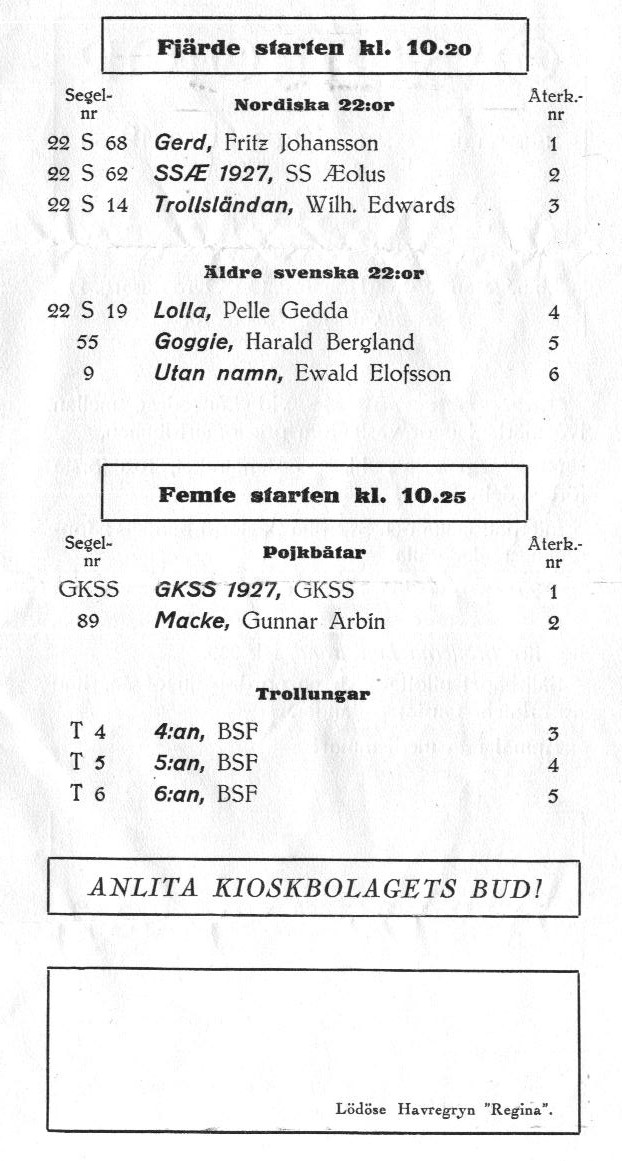 Startlistor från kappseglingar med Stjärnbåten - 1927