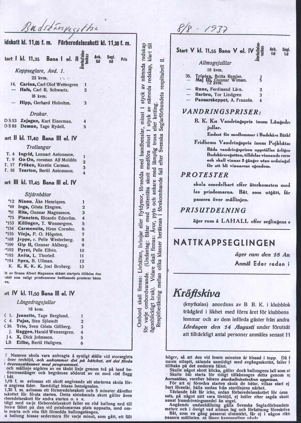 Startlistor från kappseglingar med Stjärnbåten - 1937 |